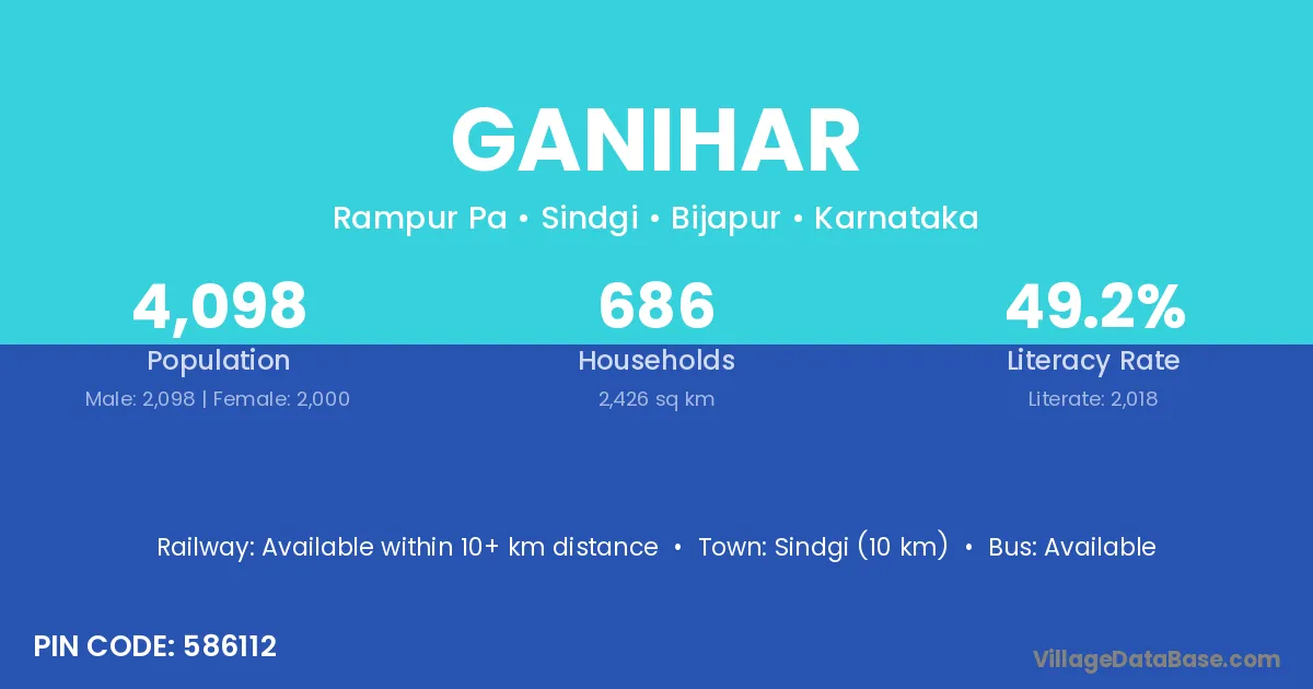 Sindgi (10 km) is the nearest town to Ganihar village for major economic activities and is located approximately 10 km away.
