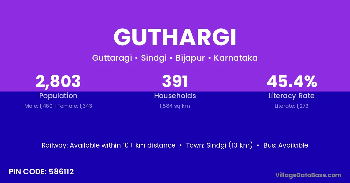 Sindgi (13 km) is the nearest town to Guthargi village for major economic activities and is located approximately 13 km away.