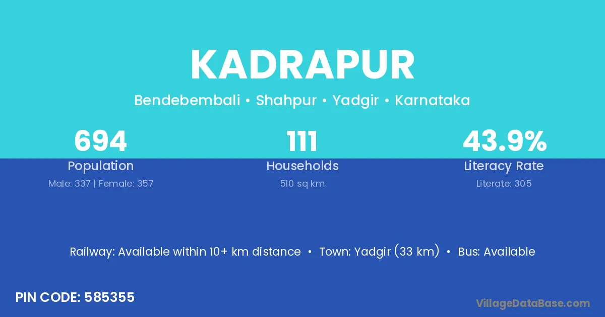 Sindgi (32 km) is the nearest town to Kadrapur village for major economic activities and is located approximately 32 km away.