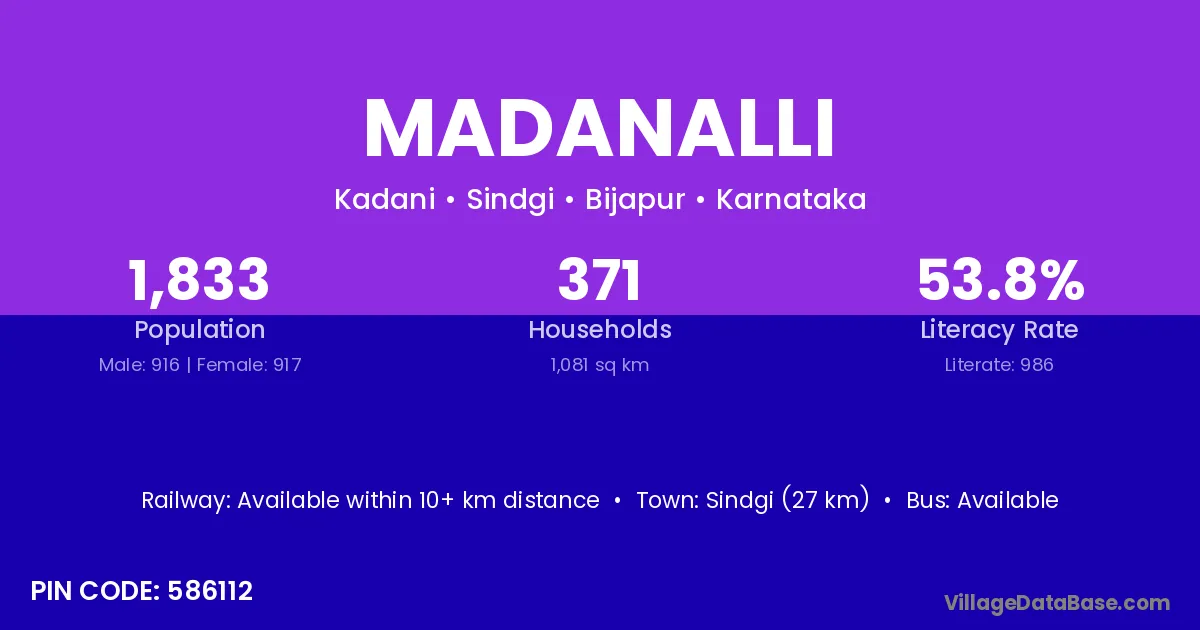Sindgi (27 km) is the nearest town to Madanalli village for major economic activities and is located approximately 27 km away.