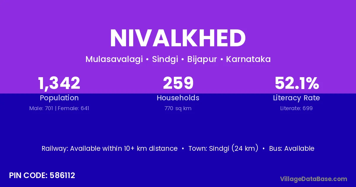 Sindgi (24 km) is the nearest town to Nivalkhed village for major economic activities and is located approximately 24 km away.