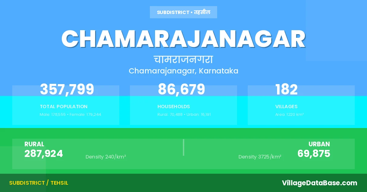 According to the 2011 census The total area of Chamarajanagar Taluka is 1220 km², with a population of 357799 people. The population density is 293 inhabitants per square kilometre, and there are approximately 86679 houses in the sub district.