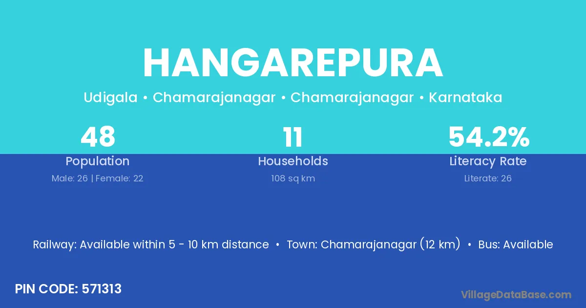 Chamarajanagar (12 km) is the nearest town to Hangarepura village for major economic activities and is located approximately 12 km away.