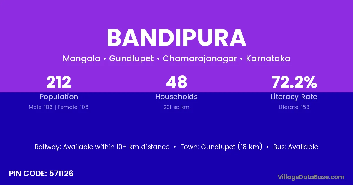 Gundlupet (18 km) is the nearest town to Bandipura village for major economic activities and is located approximately 18 km away.