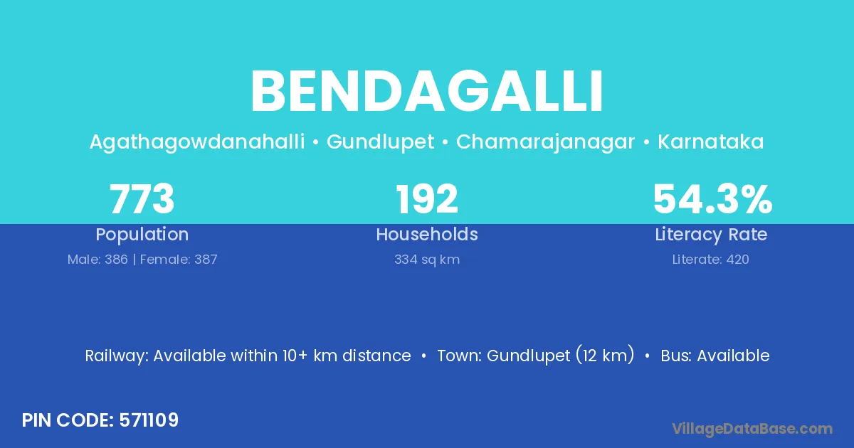 Gundlupet (12 km) is the nearest town to Bendagalli village for major economic activities and is located approximately 12 km away.