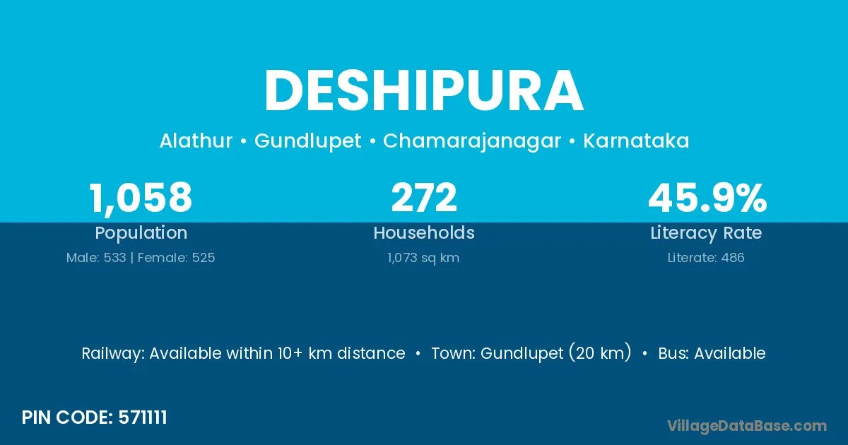 Gundlupet (20 km) is the nearest town to Deshipura village for major economic activities and is located approximately 20 km away.
