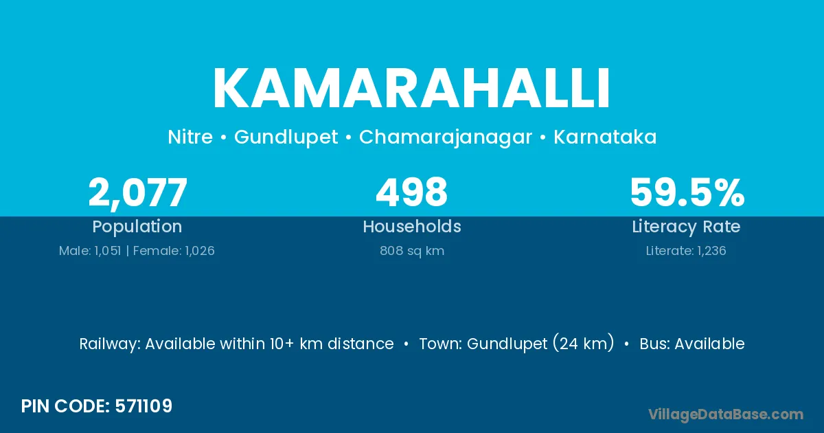 Gundlupet (24 km) is the nearest town to Kamarahalli village for major economic activities and is located approximately 24 km away.