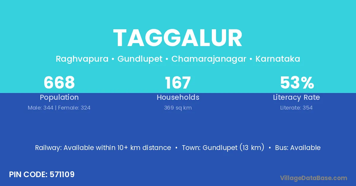 Gundlupet (13 km) is the nearest town to Taggalur village for major economic activities and is located approximately 13 km away.