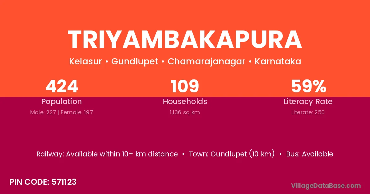 Triyambakapura village has a total population of 424 people, of which 227 are males and 197 are females.