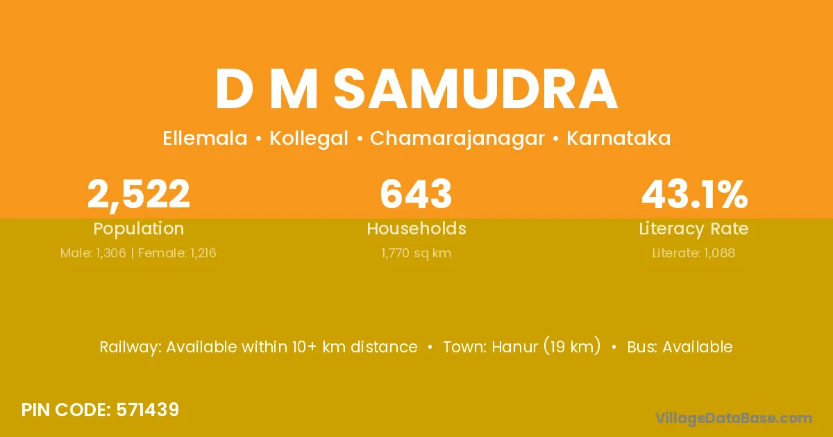 Hanur (19 km) is the nearest town to D M Samudra village for major economic activities and is located approximately 19 km away.