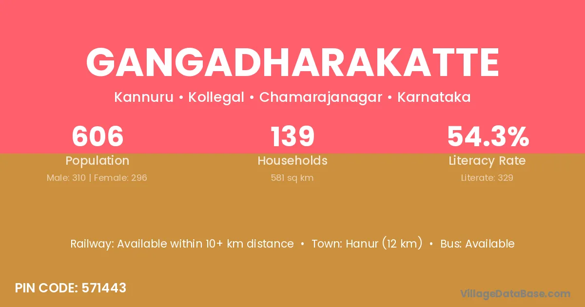 Gangadharakatte village has a total population of 606 people, of which 310 are males and 296 are females.