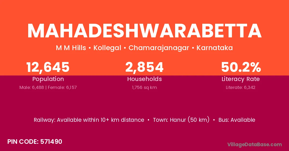 Mahadeshwarabetta village has a total population of 12,645 people, of which 6,488 are males and 6,157 are females.