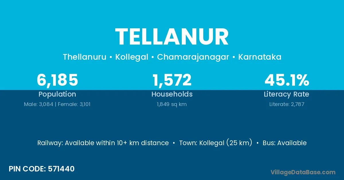 Kollegal (25 km) is the nearest town to Tellanur village for major economic activities and is located approximately 25 km away.