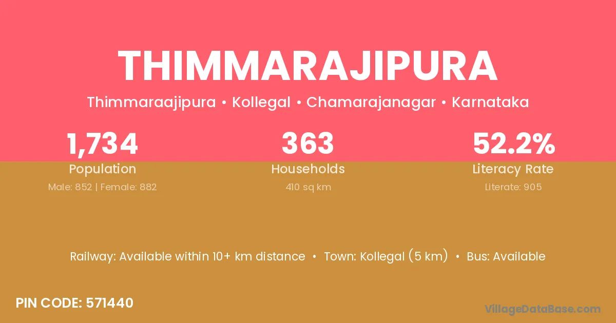 Kollegal (5 km) is the nearest town to Thimmarajipura village for major economic activities and is located approximately 5 km away.
