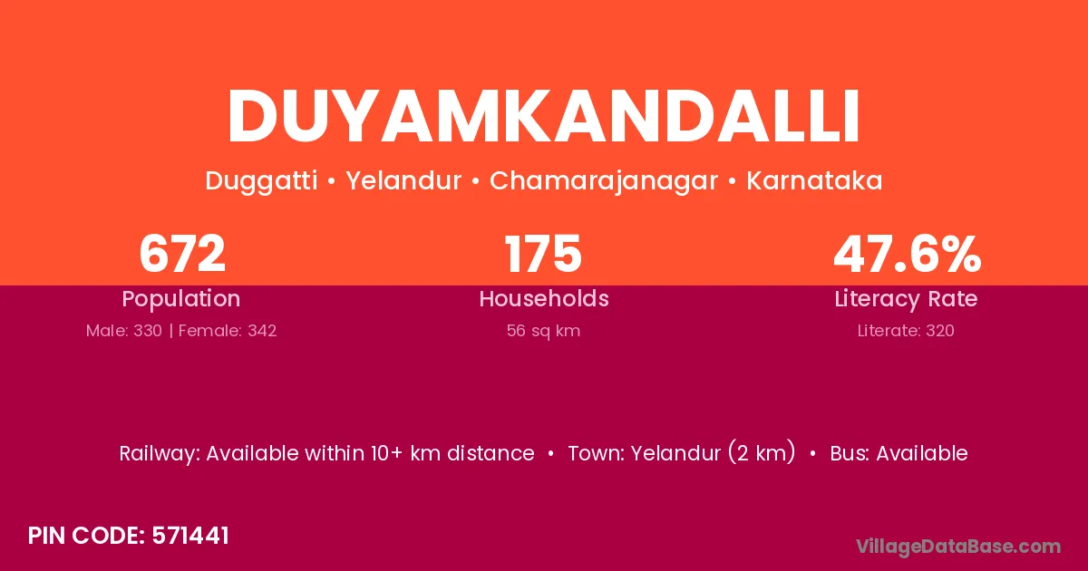 Yelandur (2 km) is the nearest town to Duyamkandalli village for major economic activities and is located approximately 2 km away.