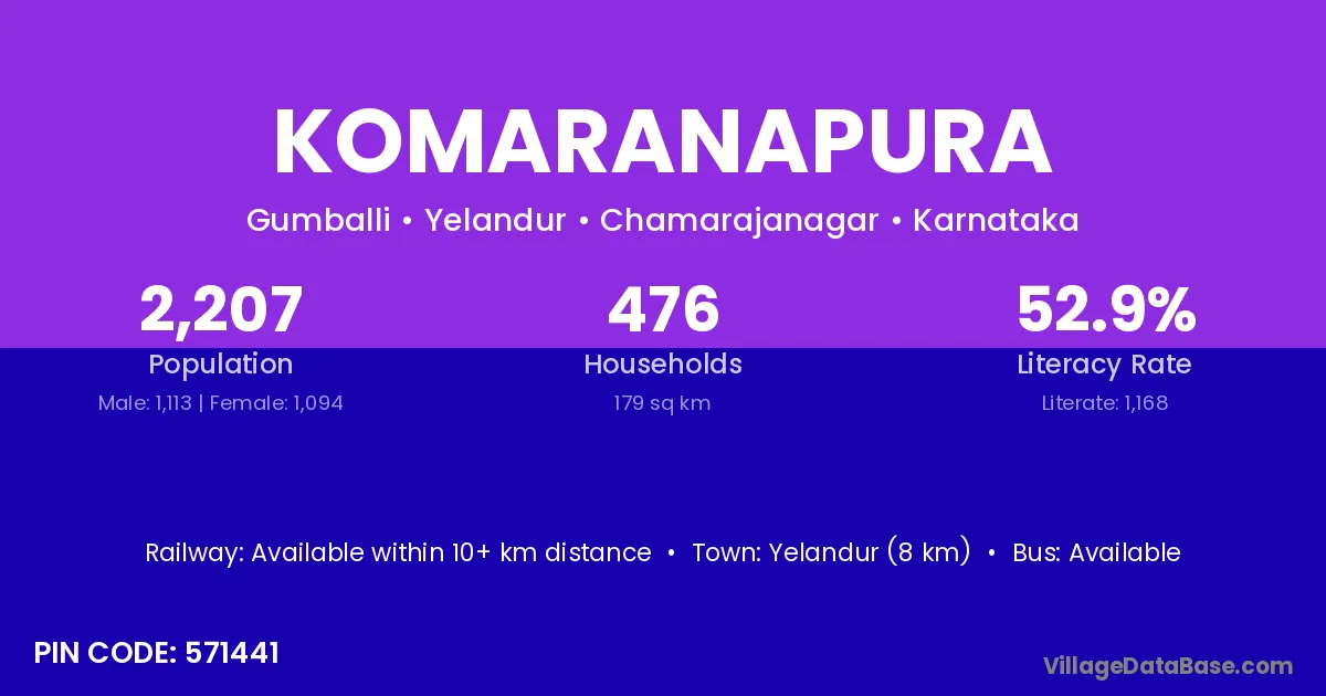 Komaranapura village has a total population of 2,207 people, of which 1,113 are males and 1,094 are females.