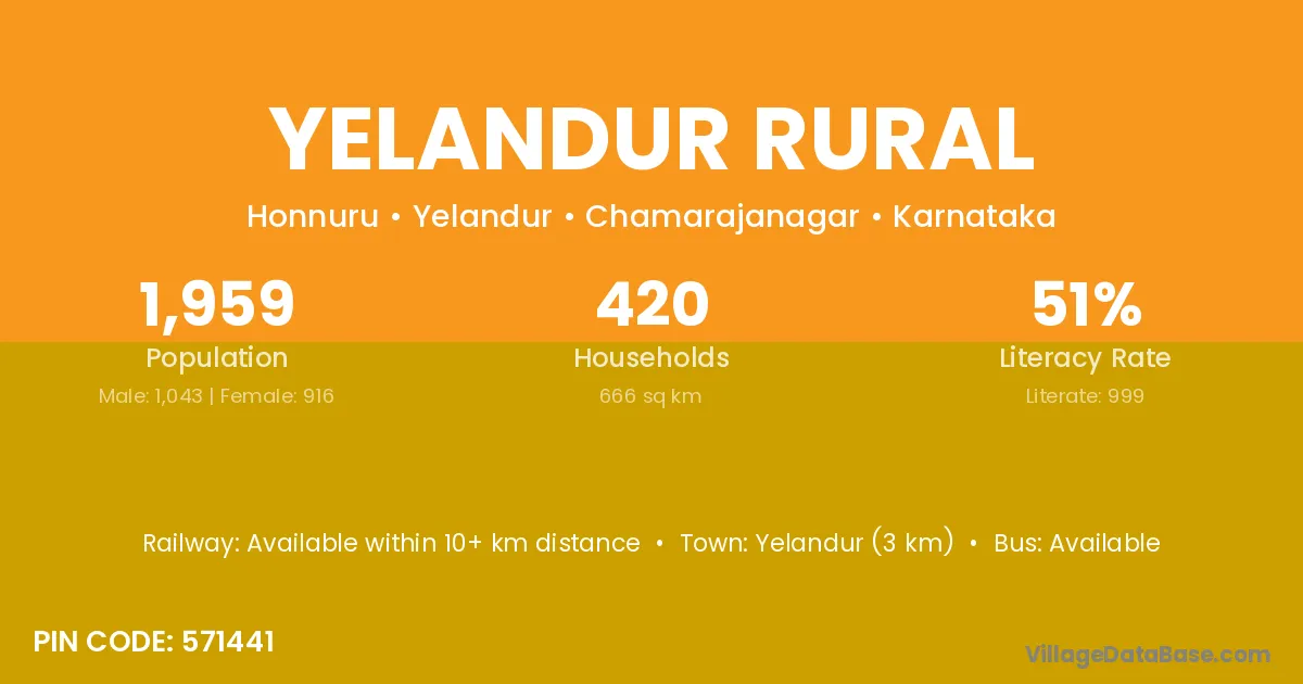 Yelandur Rural village has a total population of 1,959 people, of which 1,043 are males and 916 are females.