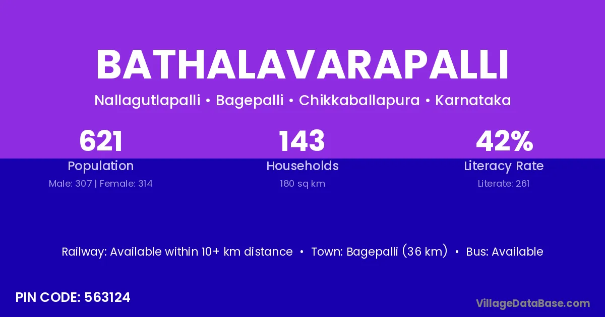 Bagepalli (36 km) is the nearest town to Bathalavarapalli village for major economic activities and is located approximately 36 km away.
