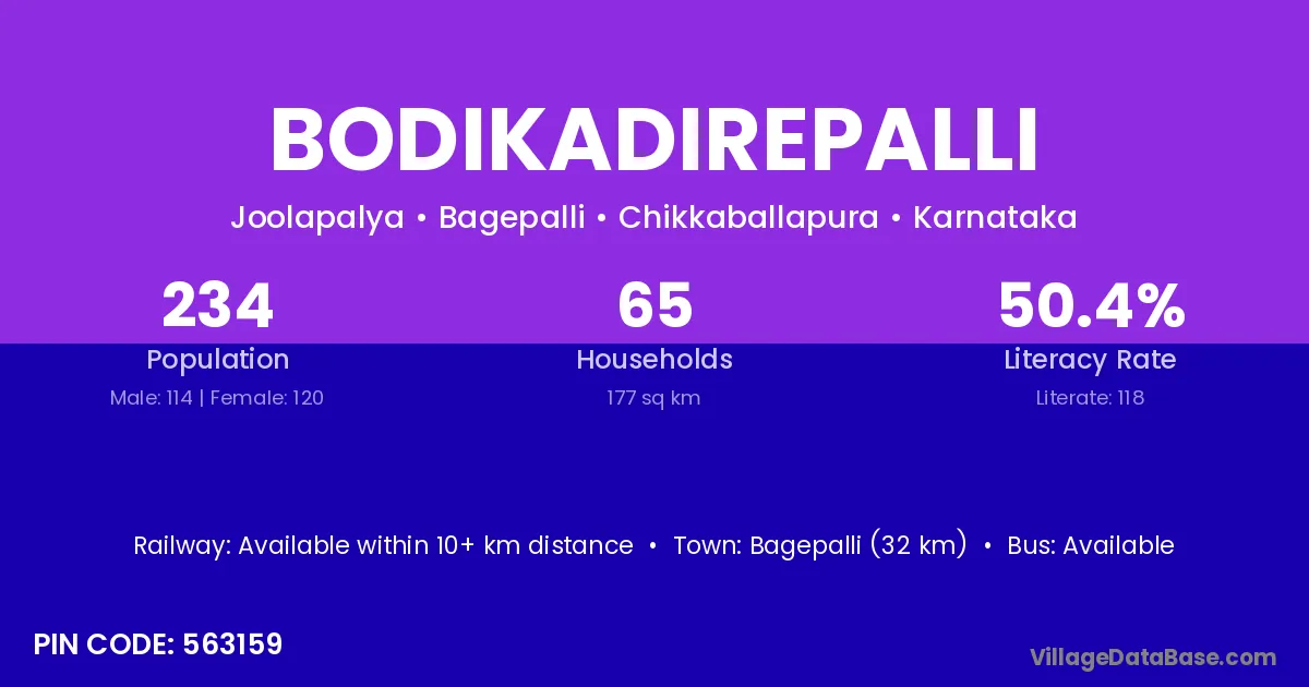 Bodikadirepalli village has a total population of 234 people, of which 114 are males and 120 are females.