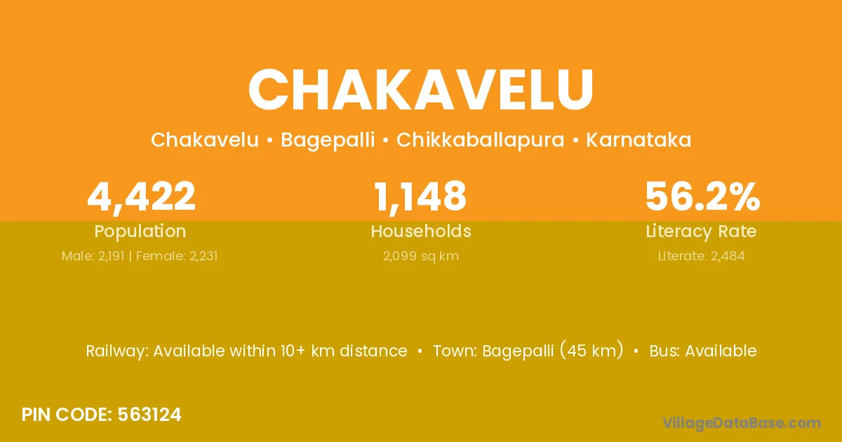 Bagepalli (45 km) is the nearest town to Chakavelu village for major economic activities and is located approximately 45 km away.
