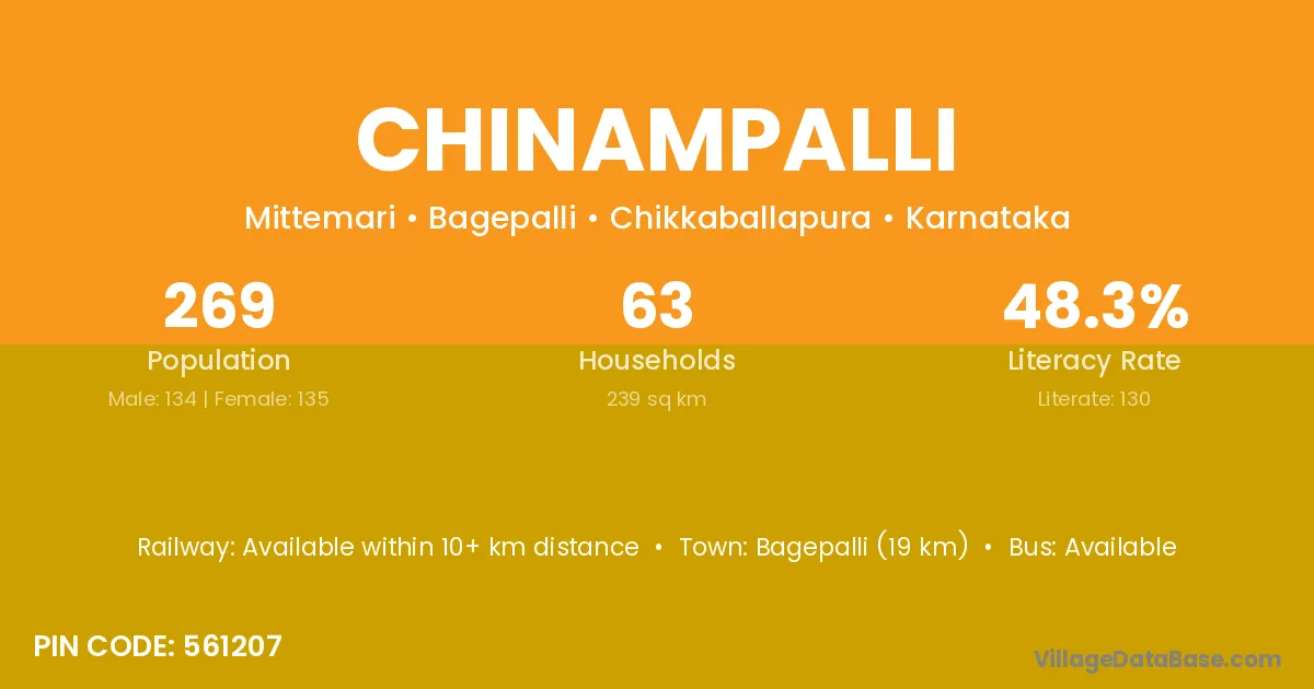 Bagepalli (19 km) is the nearest town to Chinampalli village for major economic activities and is located approximately 19 km away.