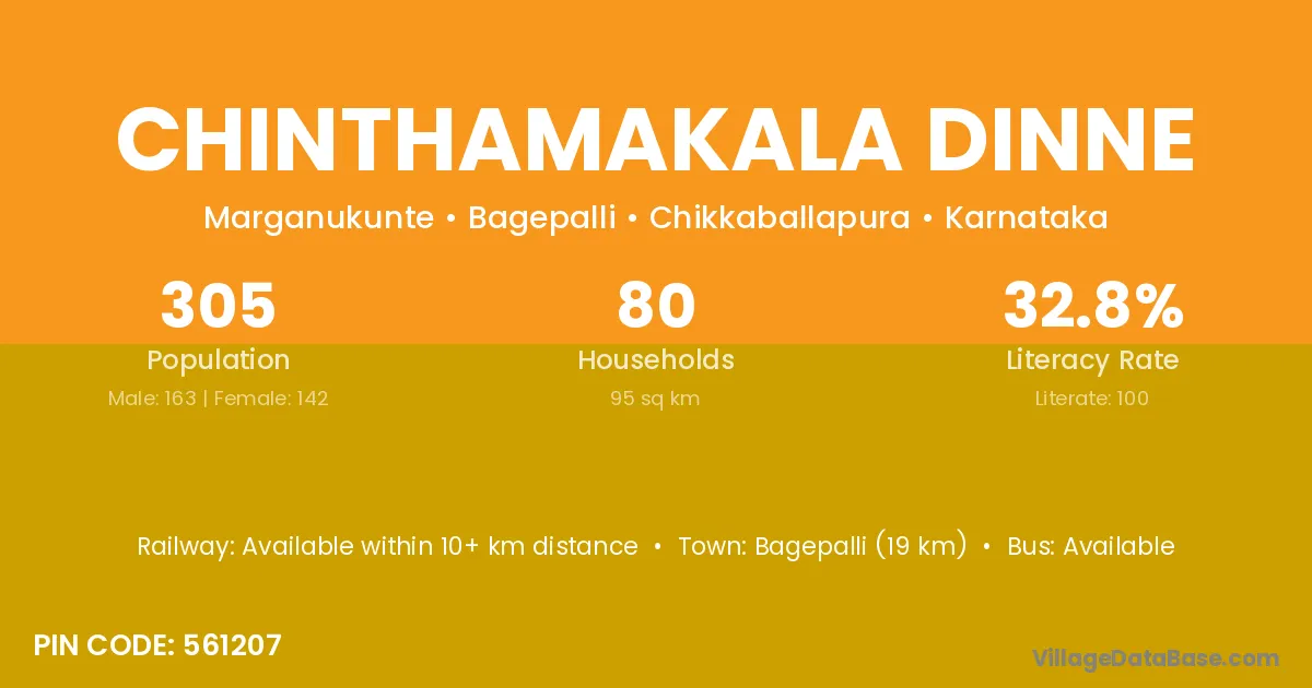 Bagepalli (19 km) is the nearest town to Chinthamakala Dinne village for major economic activities and is located approximately 19 km away.