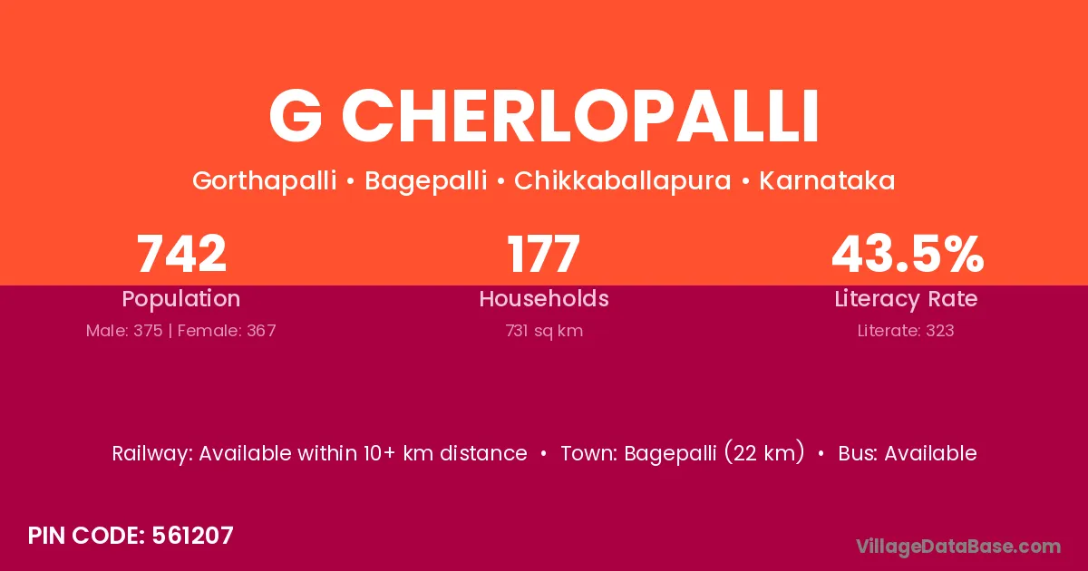 Bagepalli (22 km) is the nearest town to G Cherlopalli village for major economic activities and is located approximately 22 km away.