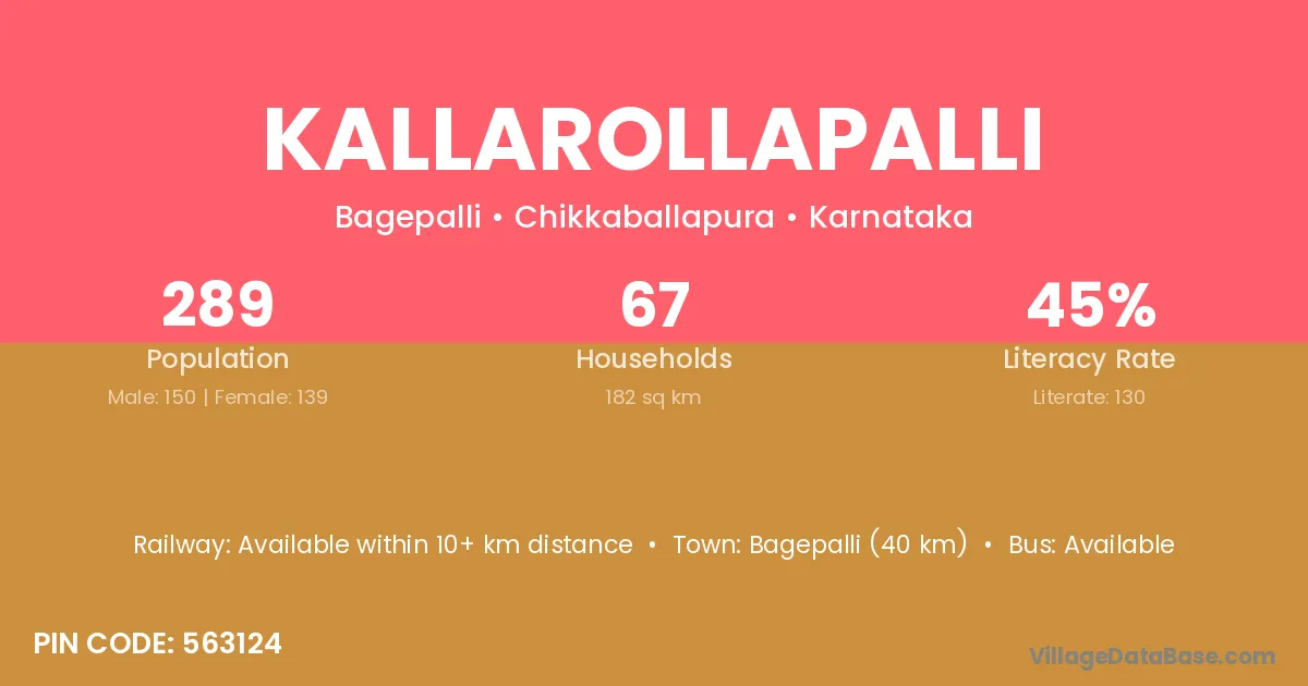 Bagepalli (40 km) is the nearest town to Kallarollapalli village for major economic activities and is located approximately 40 km away.