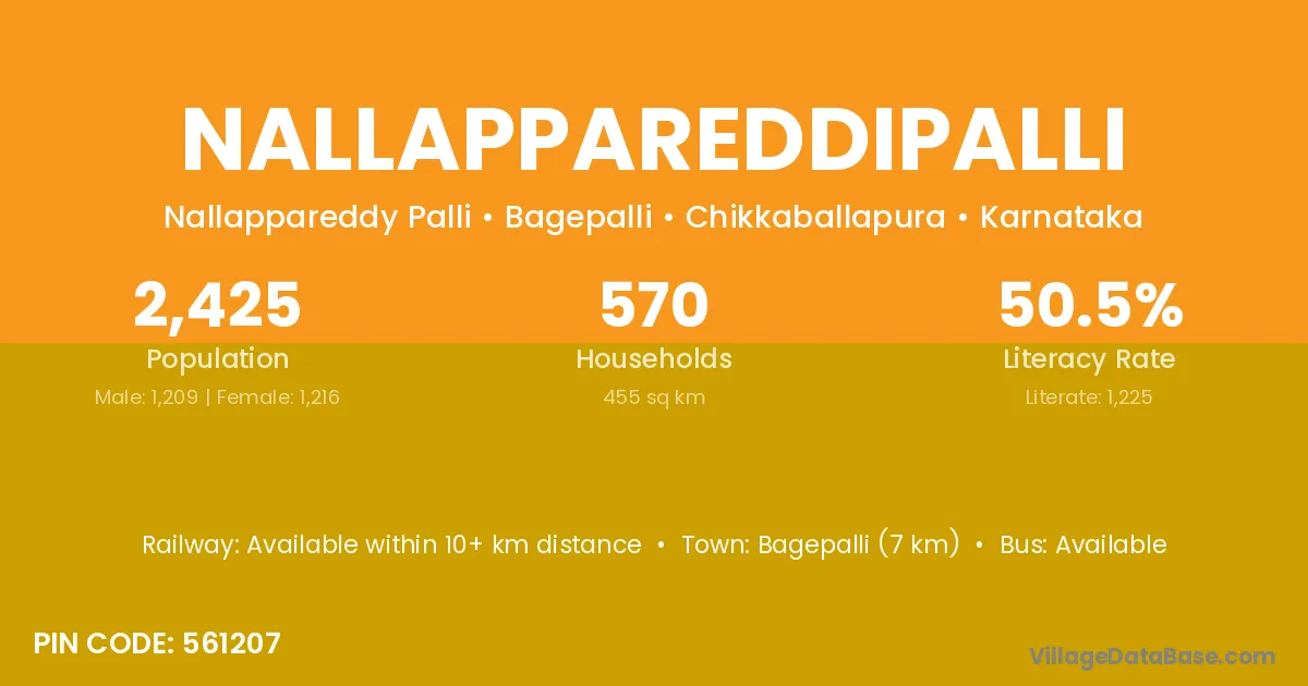Bagepalli (7 km) is the nearest town to Nallappareddipalli village for major economic activities and is located approximately 7 km away.