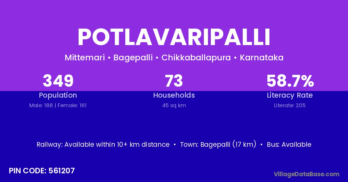Bagepalli (17 km) is the nearest town to Potlavaripalli village for major economic activities and is located approximately 17 km away.