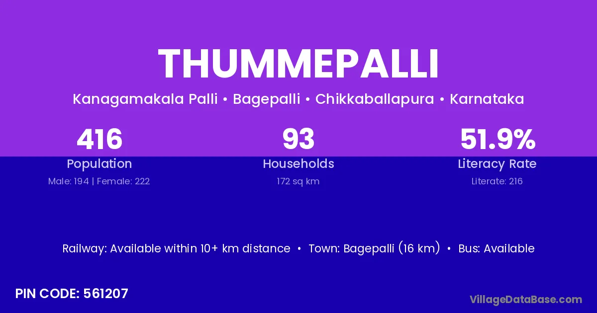 Bagepalli (16 km) is the nearest town to Thummepalli village for major economic activities and is located approximately 16 km away.