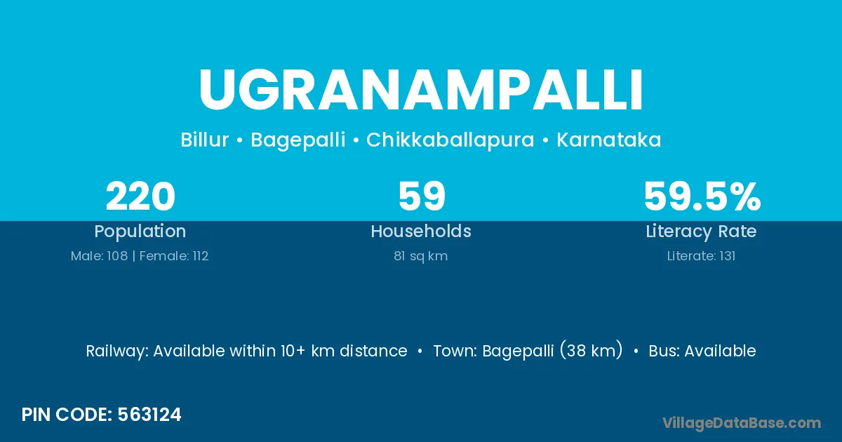 Bagepalli (38 km) is the nearest town to Ugranampalli village for major economic activities and is located approximately 38 km away.