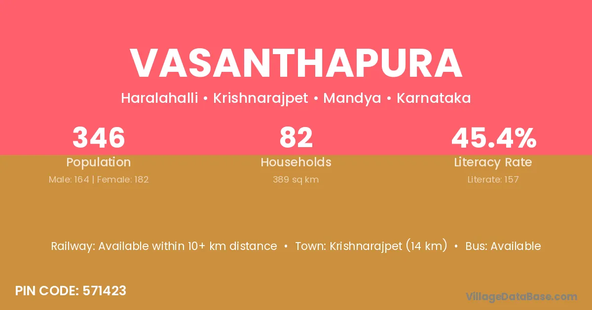 Vasanthapura village has a total population of 864 people, of which 433 are males and 431 are females.