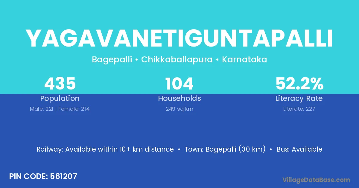 Bagepalli (30 km) is the nearest town to Yagavanetiguntapalli village for major economic activities and is located approximately 30 km away.