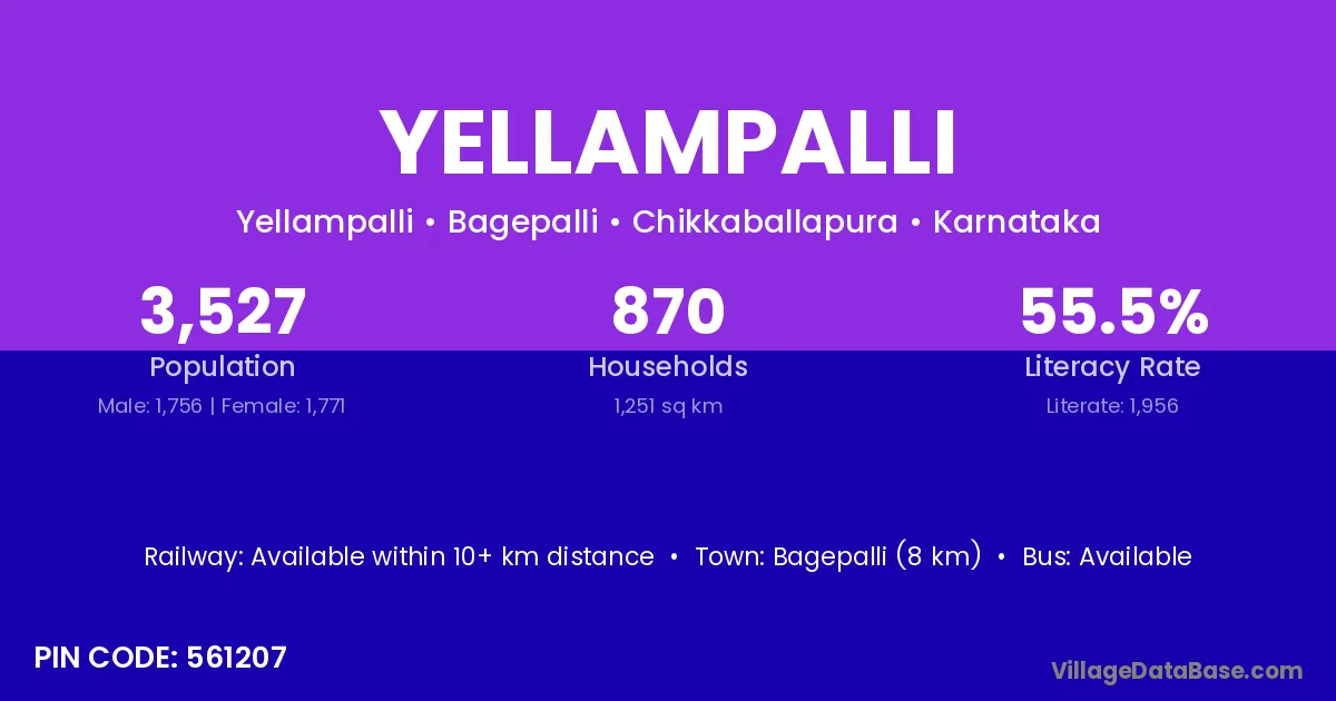 Bagepalli (8 km) is the nearest town to Yellampalli village for major economic activities and is located approximately 8 km away.
