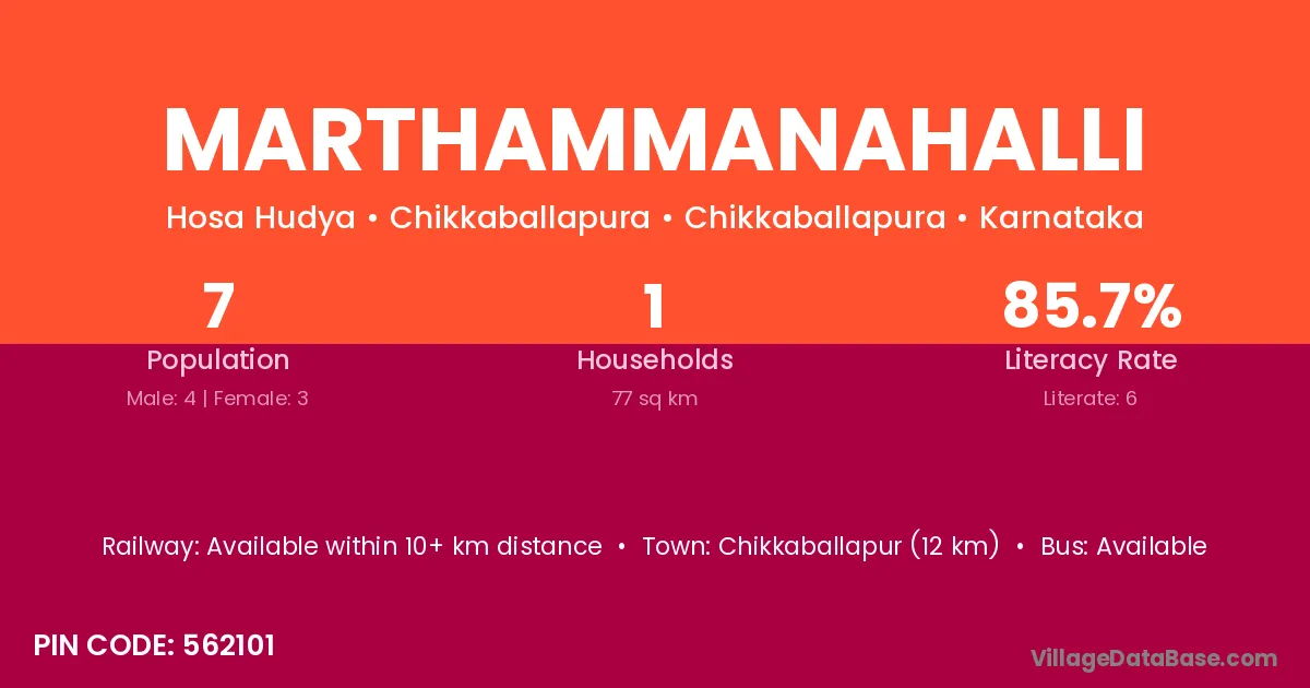Chikkaballapur (12 km) is the nearest town to Marthammanahalli village for major economic activities and is located approximately 12 km away.