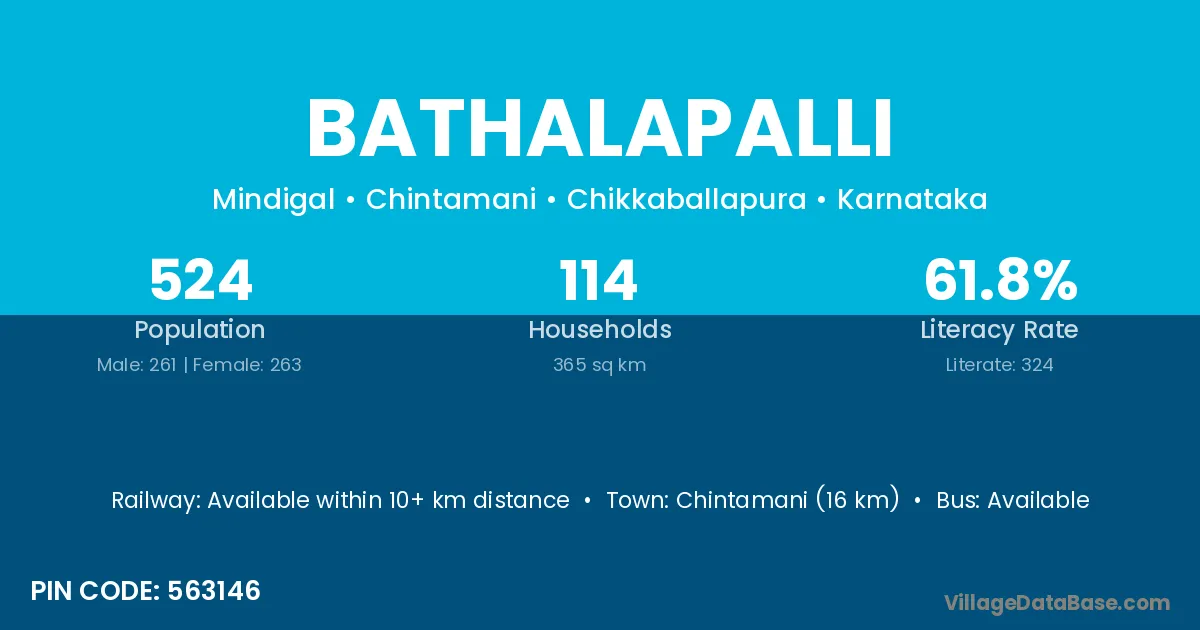 Chintamani (16 km) is the nearest town to Bathalapalli village for major economic activities and is located approximately 16 km away.