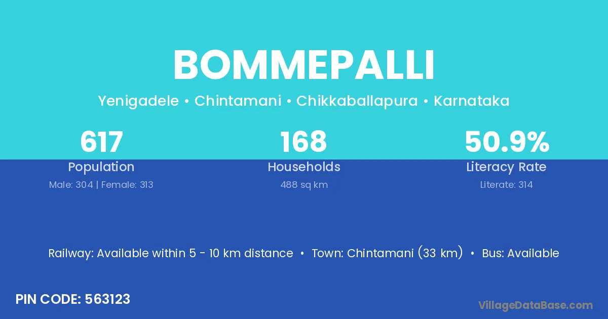 Chintamani (33 km) is the nearest town to Bommepalli village for major economic activities and is located approximately 33 km away.