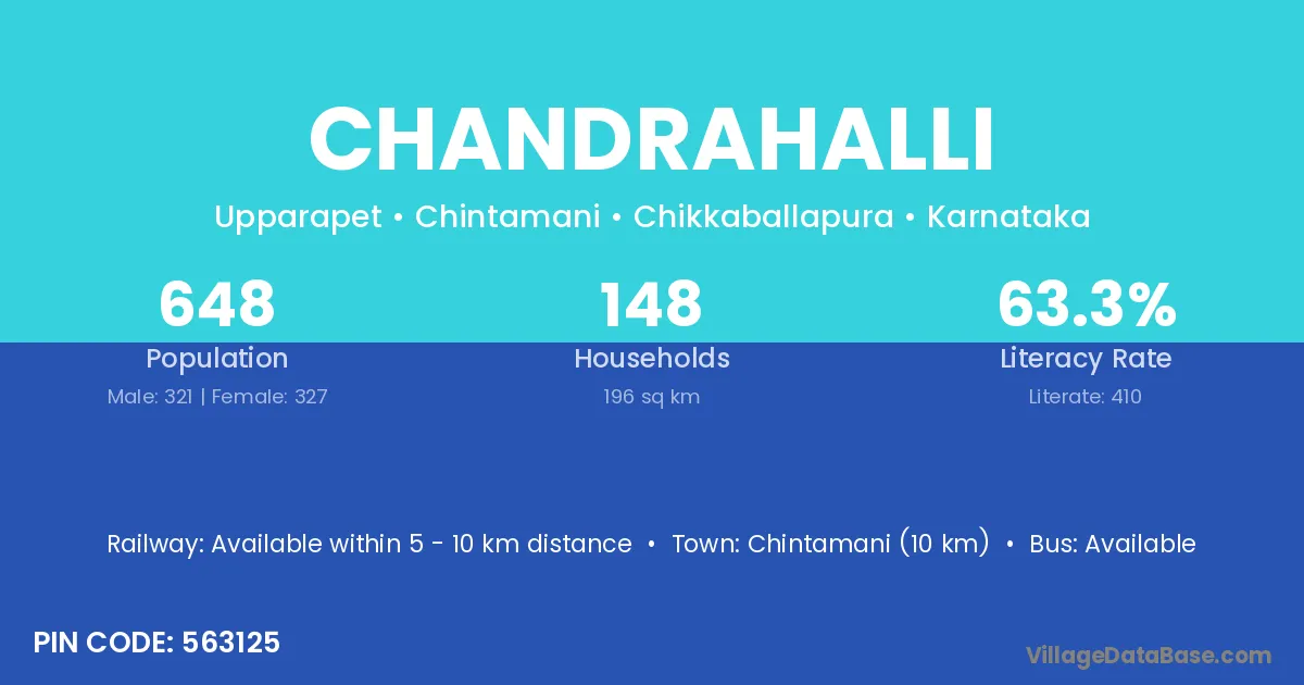 Chintamani (10 km) is the nearest town to Chandrahalli village for major economic activities and is located approximately 10 km away.