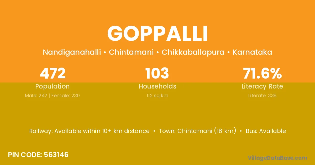 Chintamani (18 km) is the nearest town to Goppalli village for major economic activities and is located approximately 18 km away.