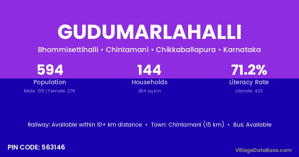 Chintamani (15 km) is the nearest town to Gudumarlahalli village for major economic activities and is located approximately 15 km away.