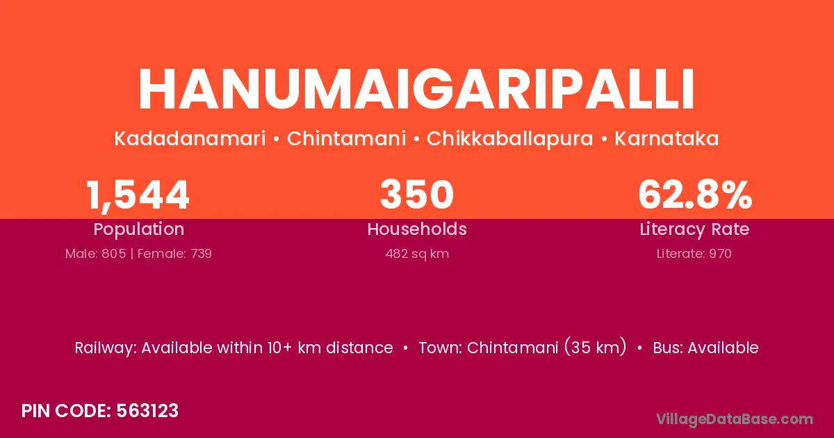 Chintamani (35 km) is the nearest town to Hanumaigaripalli village for major economic activities and is located approximately 35 km away.