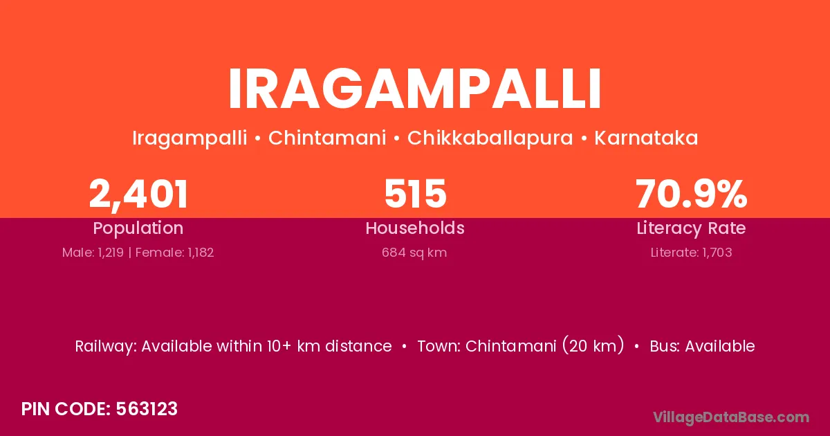 Chintamani (20 km) is the nearest town to Iragampalli village for major economic activities and is located approximately 20 km away.