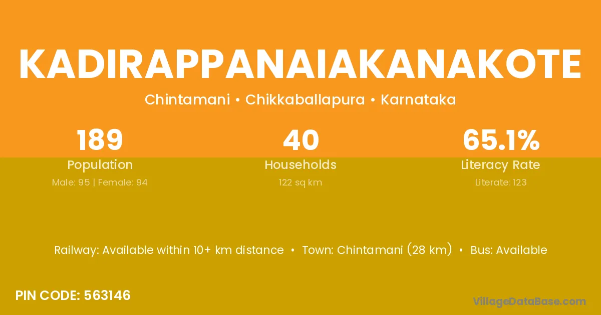 Chintamani (28 km) is the nearest town to Kadirappanaiakanakote village for major economic activities and is located approximately 28 km away.