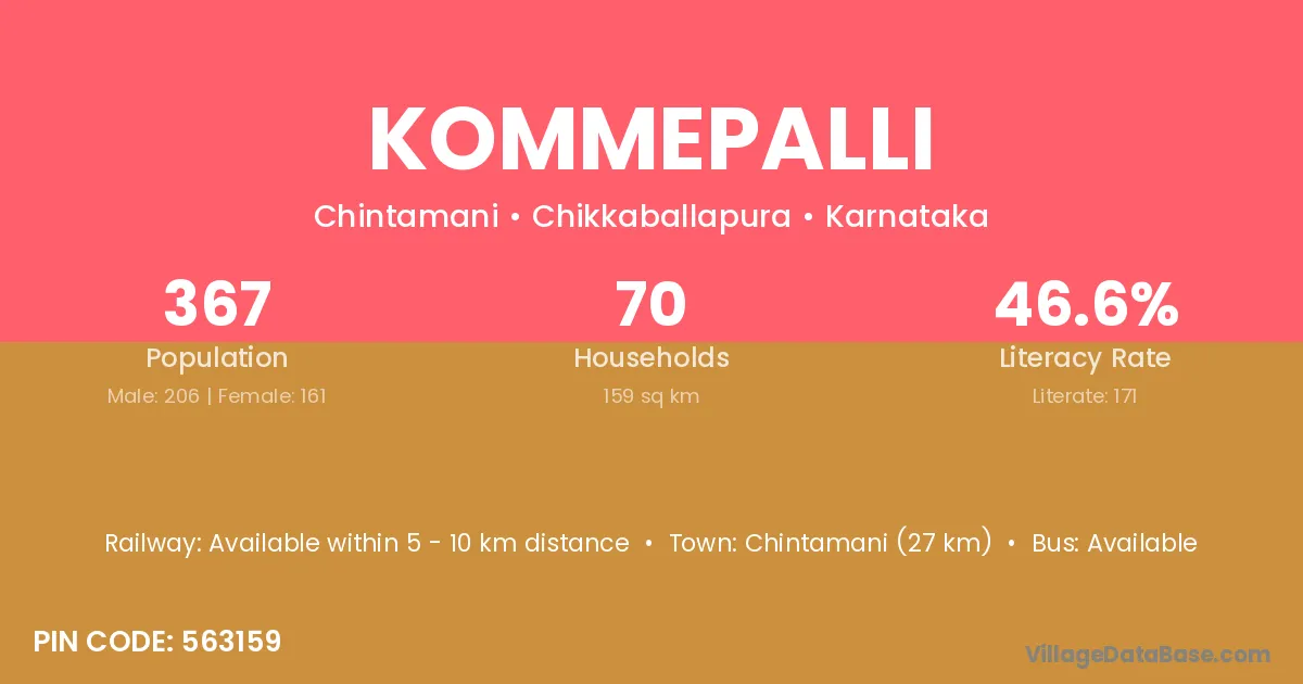 Chintamani (27 km) is the nearest town to Kommepalli village for major economic activities and is located approximately 27 km away.