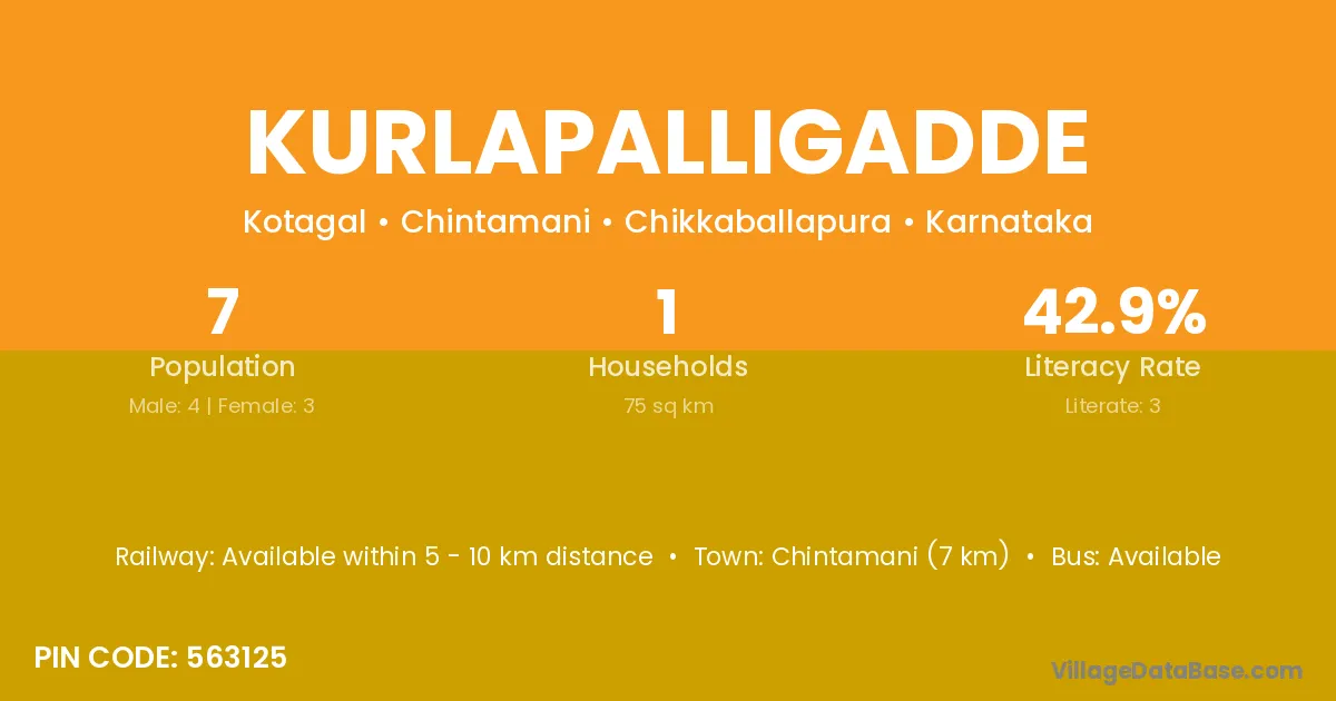 Chintamani (7 km) is the nearest town to Kurlapalligadde village for major economic activities and is located approximately 7 km away.