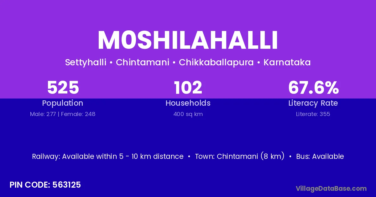 Chintamani (8 km) is the nearest town to M0shilahalli village for major economic activities and is located approximately 8 km away.