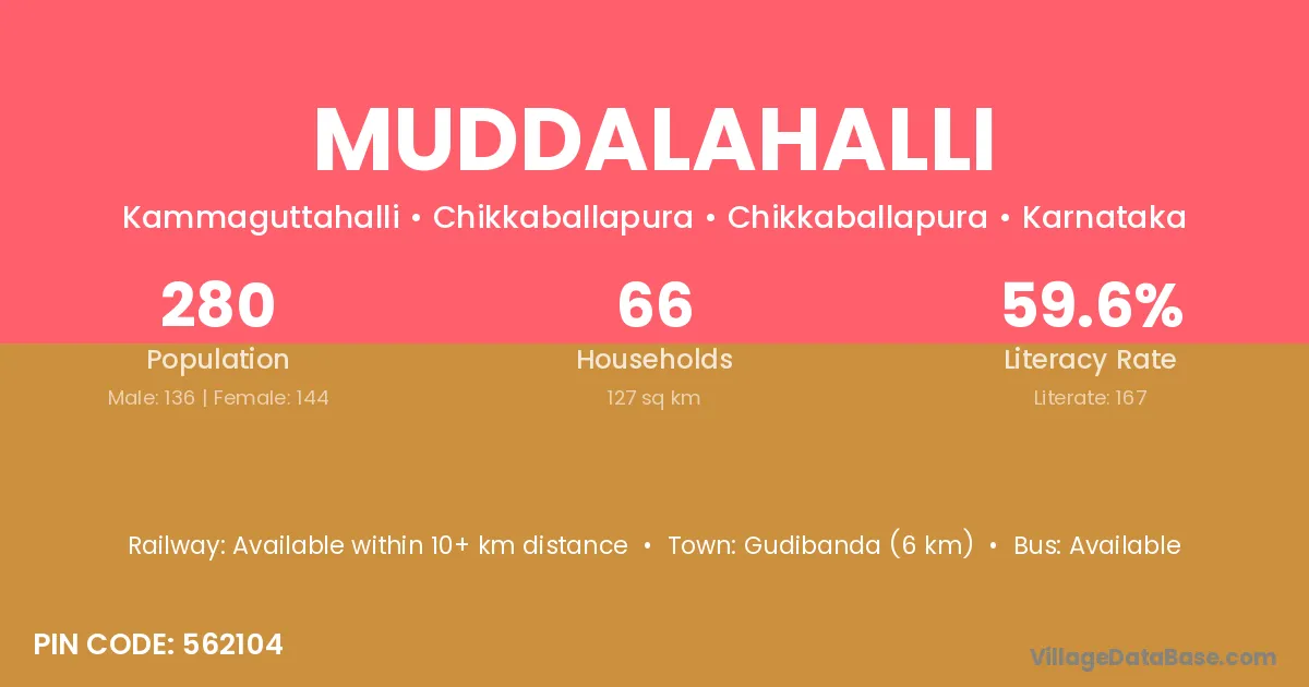 Chintamani (18 km) is the nearest town to Muddalahalli village for major economic activities and is located approximately 18 km away.