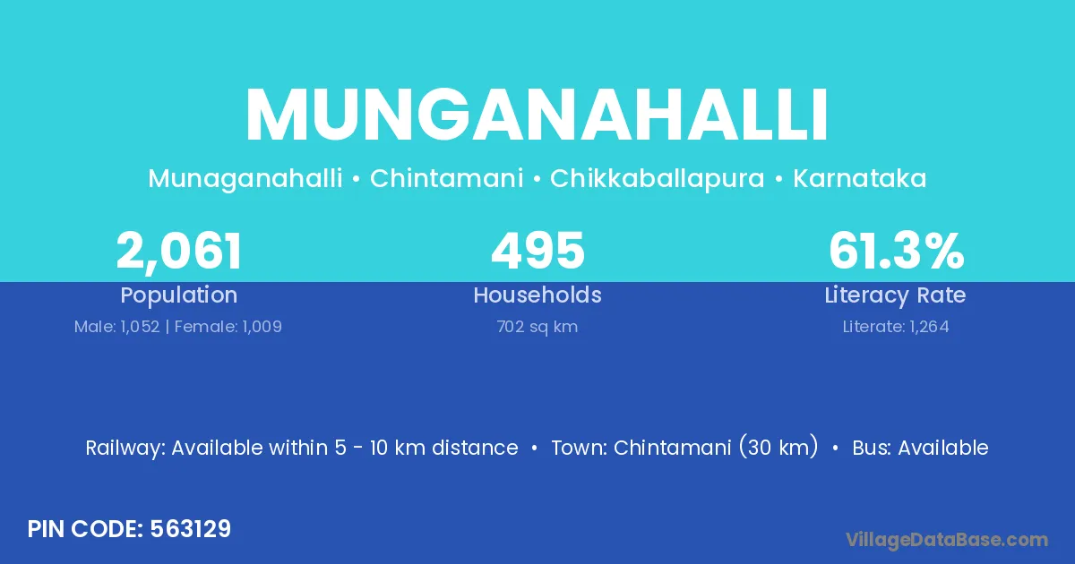 Chintamani (30 km) is the nearest town to Munganahalli village for major economic activities and is located approximately 30 km away.
