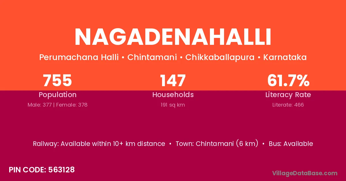 Chintamani (6 km) is the nearest town to Nagadenahalli village for major economic activities and is located approximately 6 km away.